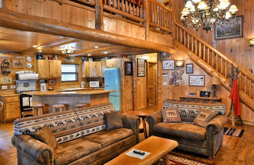 Pontoon included! Three-bedroom presidential with three queen beds and sofa sleeper on each level, lake front on Little Round, two-story loft, screened porch, balcony off the loft, two full baths, Jacuzzi tub in loft, fireplace on each level, Flat Screen TV in each bedroom and both living areas, dishwasher.
