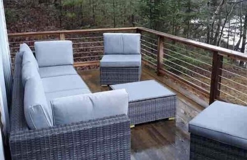 The property is a lakeside contemporary house with a large west facing wrap around deck. We are pet friendly. The house has a master bedroom and a second bedroom with a king size bed and 3 bunk beds. The house sleeps 8 guests. The interior is open plan with a kitchen, dining room area and living area overlooking the private beach and lake.