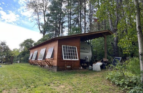 Fully equipped Camper, with a three-season front porch to double your living space. Maximum: 4 occupants. Queen-sized master bed. Futon folds down to sleep 1. Large futon on the front porch sleeps two comfortably. Bunk beds for 2 children <10. Full kitchen (3 burners, oven, refrigerator, freezer, sink, coffee pot, tea kettle, toaster, dishes, pots & pans, etc.). Outdoor grill, fire pit, and cooking tools available. Composting toilet and outhouse (no flush toilet). Indoor tiny tub/shower, plus a spacious outdoor shower, as well as washer/dryer. Close to Elizabethtown, Essex. 32 acres of woodland with trails for walking that will take you to ledges with views of Coon Mt. and Lake Champlain. Hike the easier Champlain Area Trail System (CATS trails) to the east, or the challenging Adirondack high-peaks trails to the west. Scenic waterfalls and streams are nearby. Close to Elizabethtown, Essex. Easy access from I-87, the Adirondack Northway, exit 31.