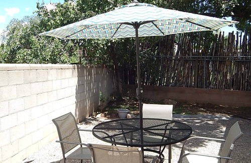Located close to the Railyard in the Guadalupe Historic District, Casita Cameo is a 600 sq. ft. (56 sq. m) one bedroom, one bath guest house. Newly renovated in 2015, Casita Cameo sleeps four with a queen size bed in the bedroom and a queen size “Room & Board” platform sleeper in the living room. There is a fully equipped kitchen, washer/dryer and a private fenced yard with a patio table, chairs and gas grill.