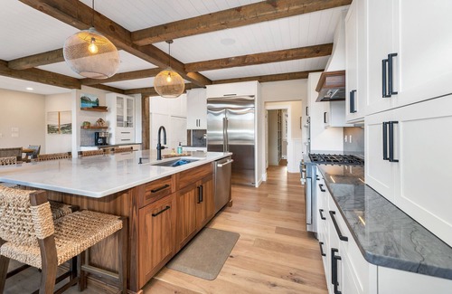 Don’t miss the breathtaking views from the landing at the top of the stairs! Sink down in the plush swivel chairs and enjoy your morning cup of coffee while soaking in the views through the floor-to-ceiling windows in the living room. The two bedrooms on one side of the second floor are hidden behind a sliding barn door; both have queen beds and share a bathroom with a shower. On the other side of the landing, you’ll find a queen bedroom with ensuite bathroom, a bedroom with two twin beds, and a bunk room with three sets of large bunks. And don’t miss the entertainment room, where everyone is sure to gather and play games or watch TV. There is one additional bathroom at this end, shared by the bedrooms and entertainment room.