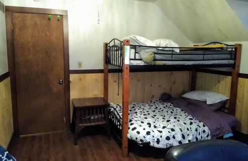 This room has a full size queen bed with a set of bunk beds (full size futon on bottom, twin size mattress on top).