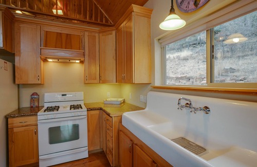 The front deck provides ample seating for viewing wildlife and enjoying the sun as it filters through the pines and aspen. The entrance opens into an open-plan living area with vaulted tongue-and-groove ceilings and pine floors throughout. The large windows surrounding the open space bring in natural light with views of trees and mountains.