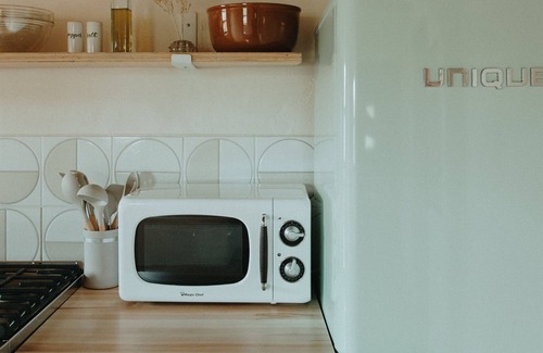 * Kitchen with local Hanselmann pottery dishware, retro refrigerator, and Café stove, plus all the basic supplies you need to cook a meal
