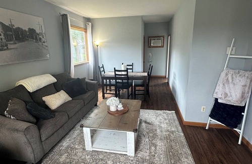 Three bedroom (and sleeper sofa), two bathroom house with new appliances. Just a short walk from the amphitheater and wedding venue. Walking access to the Apple River. Air conditioning in each room and main level. Cooking supplies and crockpot available. Sound machine in each bedroom.