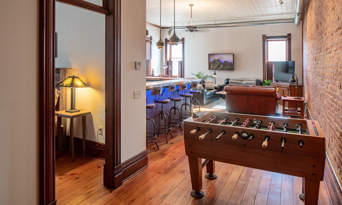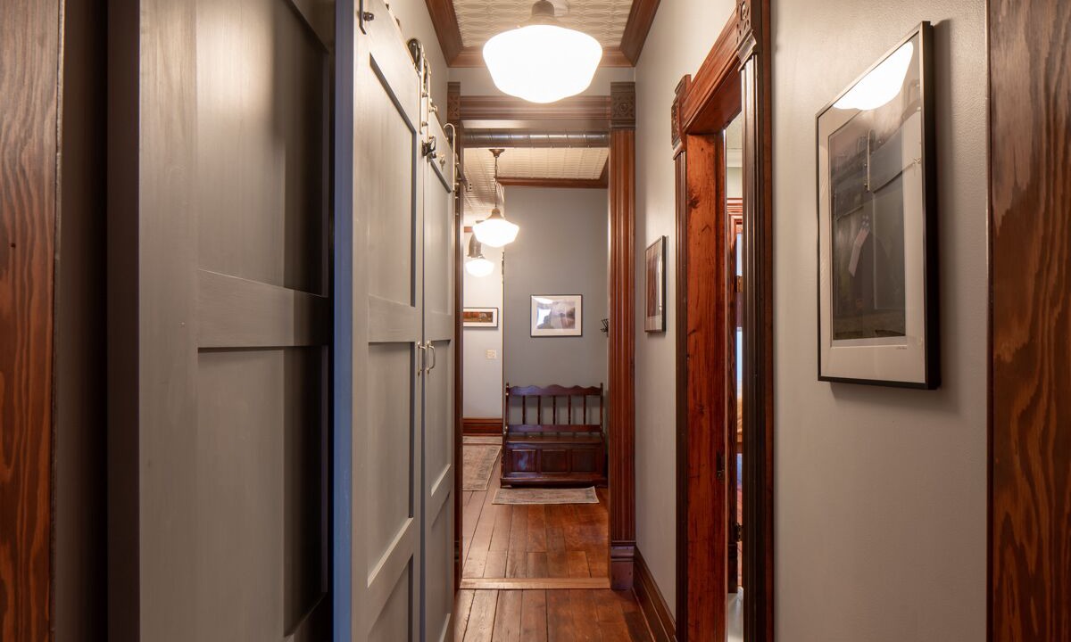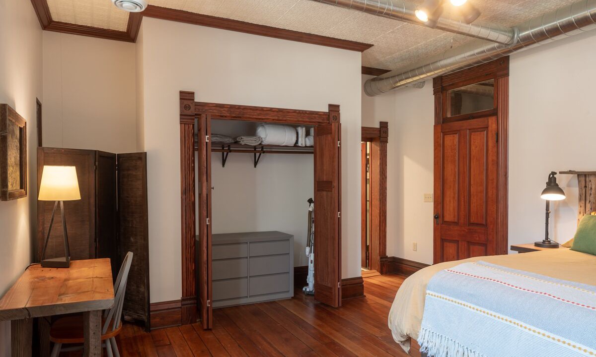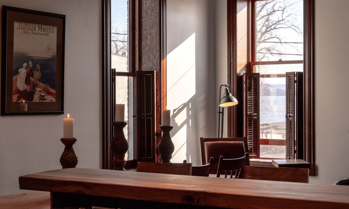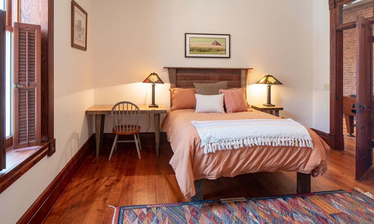 Located on the shores of Lake Pepin, Maiden Rock Loft is a beautifully restored 1893 Masonic building apartment with artistic & up-cycled touches highlighted with an extraordinary view of the lake. This attractive and comfortable 1500 ft2 apartment features the work of local artisans, including custom inlaid concrete kitchen counter, white oak bar, douglas fir trestle table, custom upcycled light fixtures, reclaimed rustic barn wood bedroom furnishings and custom cabinetry throughout. A soaring 19th century pressed tin ceiling and original douglas fir flooring & trim and large windows hold this artistic space beautifully. Modern appliances (gas range, refrigerator/freezer, dishwasher, washer/dryer) and new furnace & air conditioner create comfort and ease within this light filled historic space. If you're looking for more than just 'a place to stay' in the Lake Pepin Driftless area of Wisconsin area, Maiden Rock Loft offers a lodging experience that simply glows with historic & artistic character, natural light and inviting comfort.