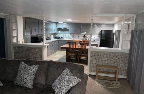 2 bedroom house right on Marina Road! This house has everything you need to enjoy a week or even just a couple of nights at the lake. The house is conveniently located on Marina road, with a large driveway big enough to accommodate your boat during your stay. The kitchen is fully stocked with dishes and cooking items, and has a electric stove, dishwasher, and refrigerator. The large countertop allows for plenty of room for prepping meals, or setting up your buffet. The living room has two couches, shuffleboard, and a 55” flat screen tv(no cable but you can always stream with your online account). And of course it wouldn’t be a trip to the lake without a camp fire at least one night, and the fire pit in the yard is the perfect spot for it.