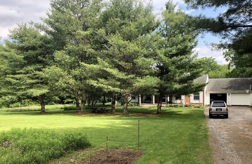 1986 ranch house on 115 acres. You cannot see any neighbors from our house. Great for dog owners and families. 2 bedrooms but one is large with a king and twin and other is with a queen. The couch in the living room is big enough to sleep on as well. Can hike all through the property. We have one lovely trail made to a creek that is super easy to walk.