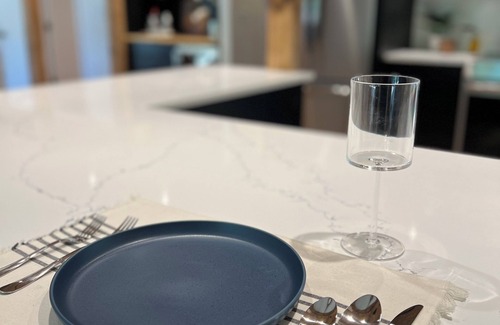 The big, well-appointed kitchen is a chef’s dream, equipped with an induction range, microwave, dishwasher, and a French door fridge with water and ice. There's also a separate coffee and bar area with a Keurig coffee maker & beverage fridge, perfect for entertaining. The dining table seats 8, making it perfect for group meals, game nights, or memorable gatherings.