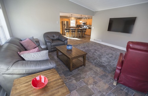The home has an open floor plan with large rooms. You will be able to relax comfortably during your stay. The master bedroom has a king bed and flat screen TV. A queen bed and twin over twin bunk beds are in the second bedroom. The lower level has a twin over full bunk bed to accommodate 3 additional guests.