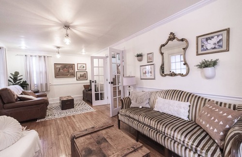 The home was built in 1914 and has been lovingly restored. Schilling House can sleep eight comfortably with one king, one queen, and one full size bed, as well as a queen size futon. The grounds include a nice back yard and fire pit, and a lovely front porch with a town street view.