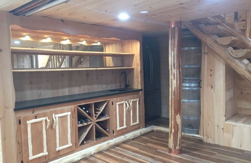 We just upgraded the kitchen with new GE Café appliances. We also installed a new custom-built wet bar in the basement with another large refrigerator. Yes, we have granite countertops. It has garnet in it. It came from the local mine.